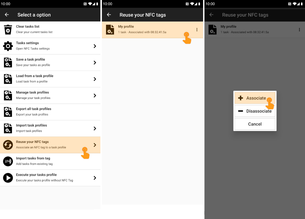 - Scan your NFC tag in order to execute your tasks profile.